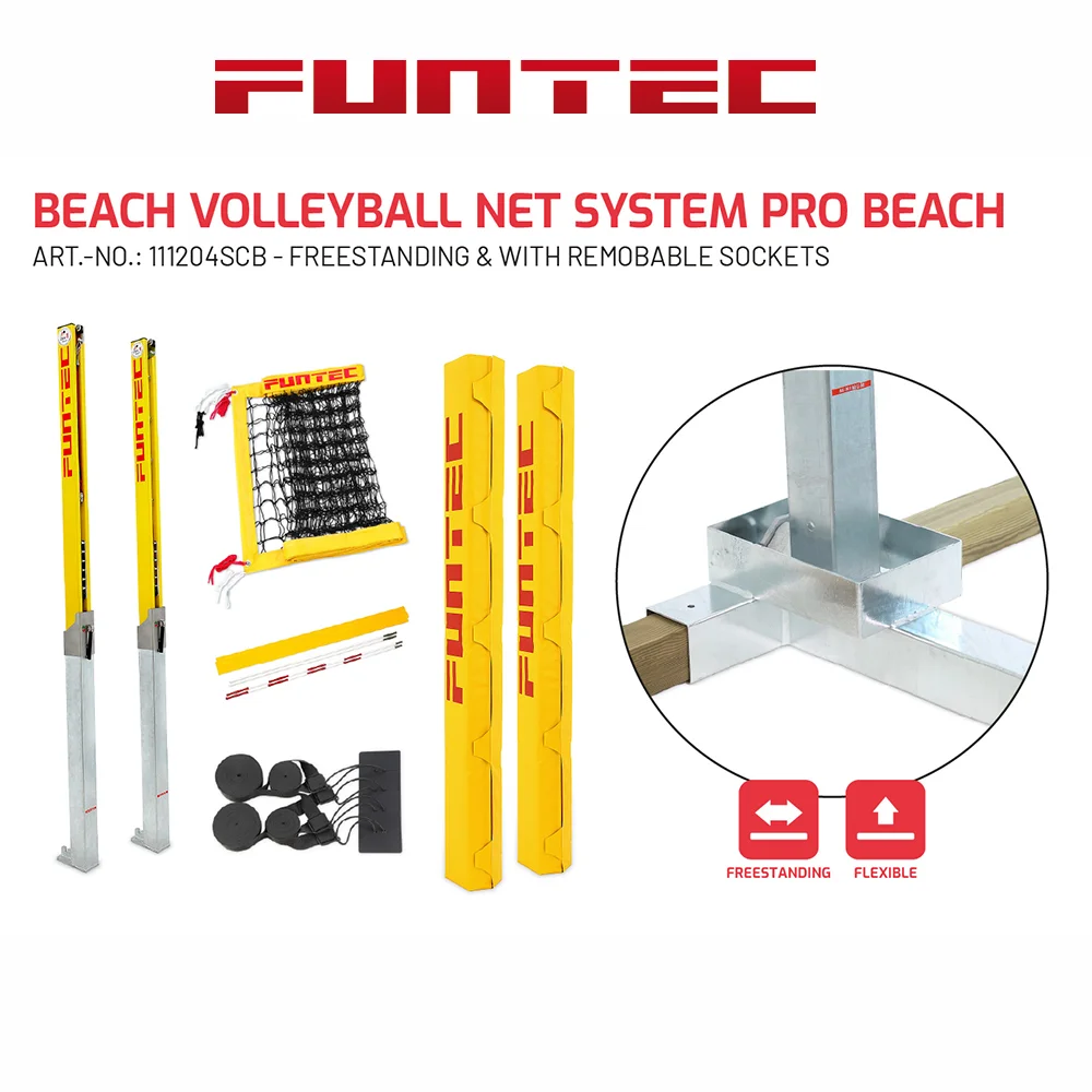 Funtec Pro Beach Switch är en enormt bra nätsystem för beachvolleyboll. För montering där beachvolleyplanen skall vara på samma ställe eller om ni tänker bygga en plan för ett evenemang för kortare tid. Detta set av Funtec Beach Pro med Switch lösningen är främst tänkt till beachvolleyboll där man kombinerar sanden till andra evenemang och sporter, tex. beachtennis eller beachhandboll. Med en speciallösning plockar du lätt bort Pro Beach stolparna och kan fylla igen hålet och använda ytan till något annat. Förankringen sitter kvar under sanden vilket gör att du lätt och smidighet kan sätta tillbaka stolparna vid önskat tillfälle. Pro Beach stolpsystem är världsledande med sin unika kvalité och funktionalitet. Lätt att montera i sanden och mycket lätt att hantera och justera tex. näthöjd. En unik detalj är fjädringen i stolpen vid höjdjustering vilket gör att du enkelt och snabbt kan justera höjd med millimeters precision även när nätet är fullt uppspänt.