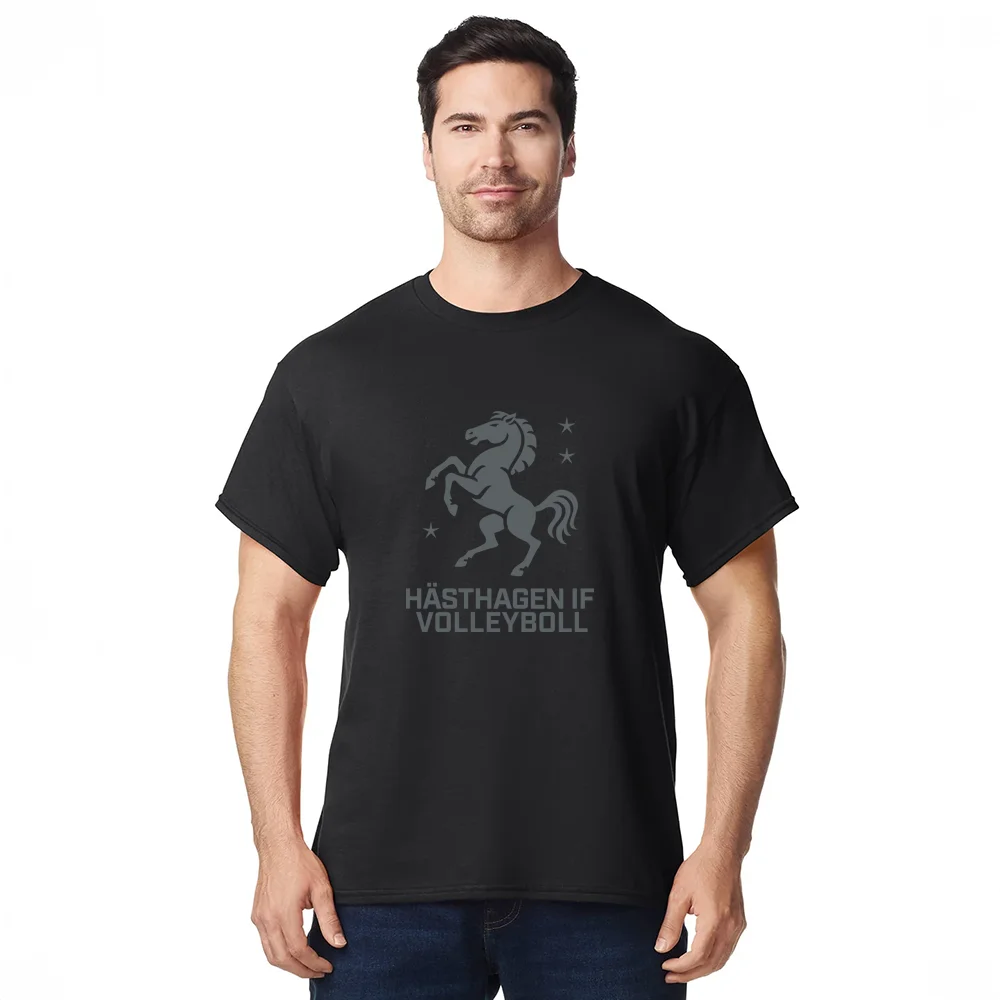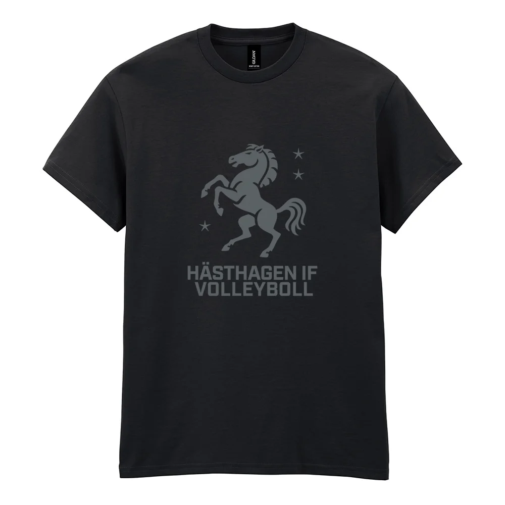 Vi trycker stora Hästhagen Volleyboll logotypen fram på t-shirten.